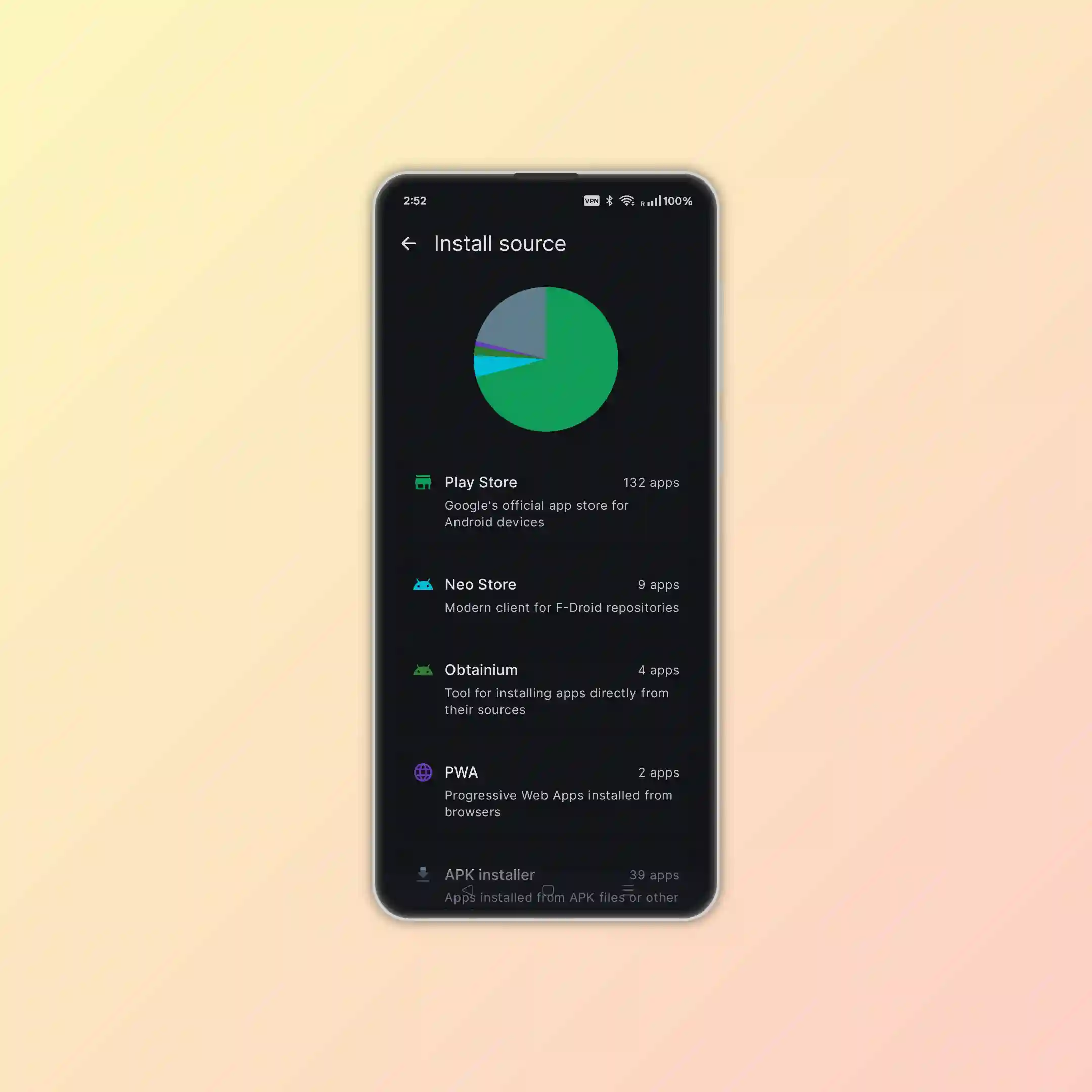 - Install Sources: See which apps came from Play Store, system, sideload, or PWA