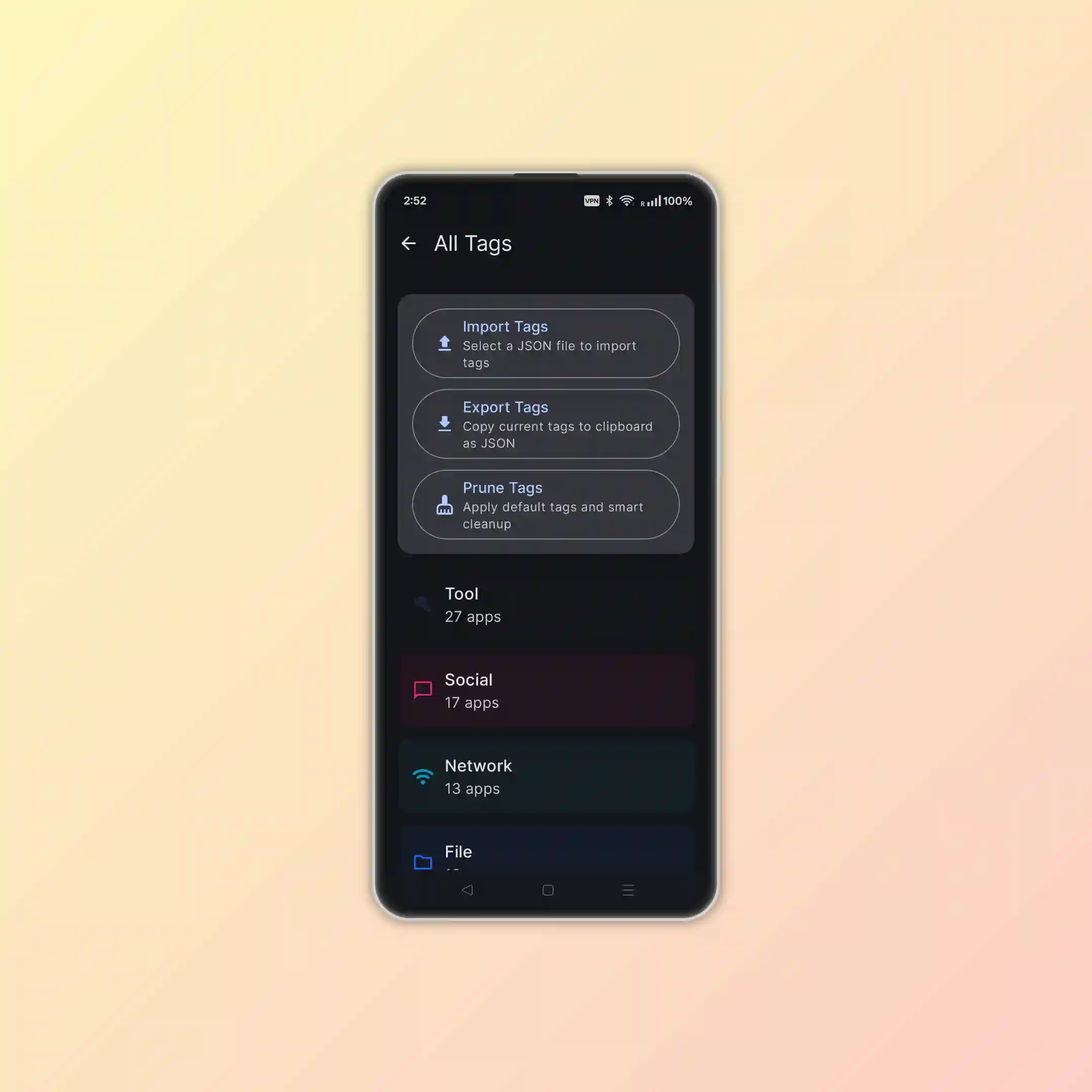 - Tags: Add custom tags to any app (#work #kids #offline)