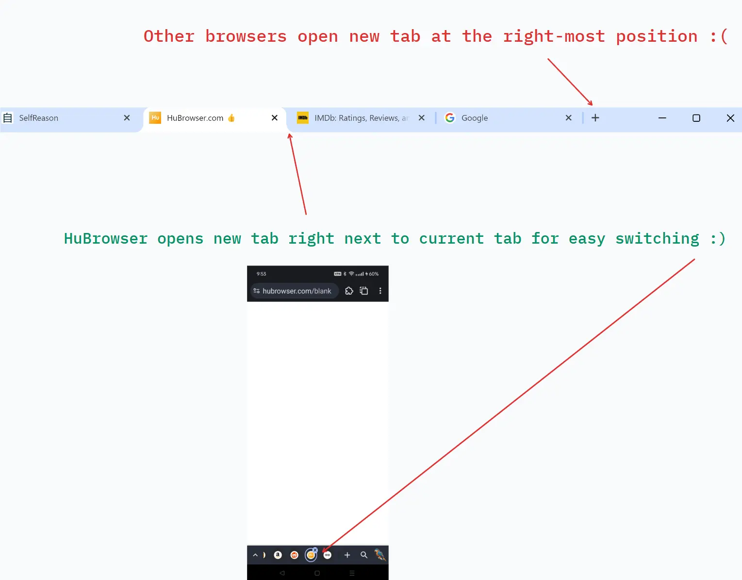 - Smart tab positioning: HuBrowser always opens new tabs to the right of the current tab, so you can easily find it and switch back